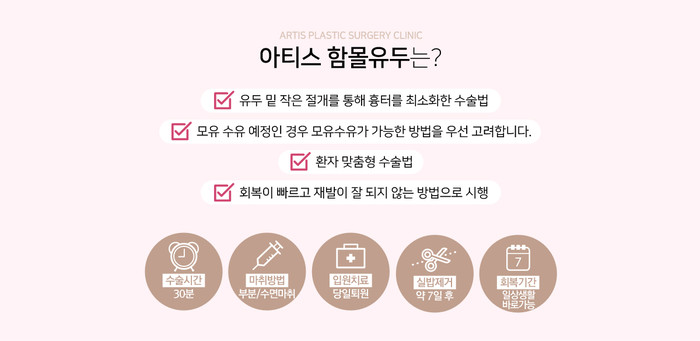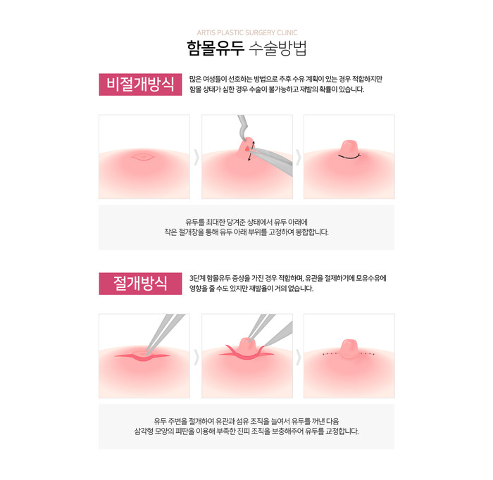 그에 비해 앞서 올린 가슴성형과 유두축소가 동시에 필요한 경우, 또한 함몰유두와 가슴성형수술이 동시에 필요한 경우라면 역오메가절개의 추가적인 절개가 불필요하며, 나아가 유방확대 목적의 가슴성형 역오메가절개는 이중평면법 적용에도 가장 유리한 방법이며, 만일의 경우 재수술이나 흉보형물 제거에도 최적의 절개입니다. 특히 가슴 성형수술 방법 중 통증이 가장 적은 방법입니다. – 함몰유두수술은 유관을 절제하면서 수술하는 것이 가장 좋은 방법이지만 나중에 수유할 수 있도록 수술도 가능합니다. 즉 함몰 유두 수술 후 정상적인 수유도 가능합니다.- 유방확대를 목적으로 한 가슴성형수술과 함몰유두수술은 동시에 가능하며 여러 곳에 상처를 남기지 않기 위한 역오메가 절개를 권장합니다. – 함몰유두수술은 재발방지를 위한 약 2~3주간 견인치료가 필요합니다.