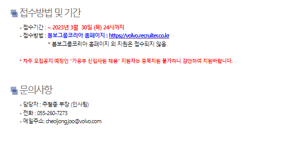 – 접수방법 : 한국볼보그룹 홈페이지 : https://volvo.recruiter.co.kr