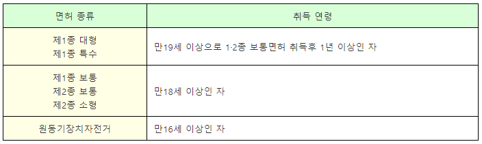 - 면허의 종류에 따라 다음과 같이 연령에 도달하지 않으면 운전면허를 받을 수 없습니다(「도로교통법」 제82조 제1항 제1호 및 제6호).