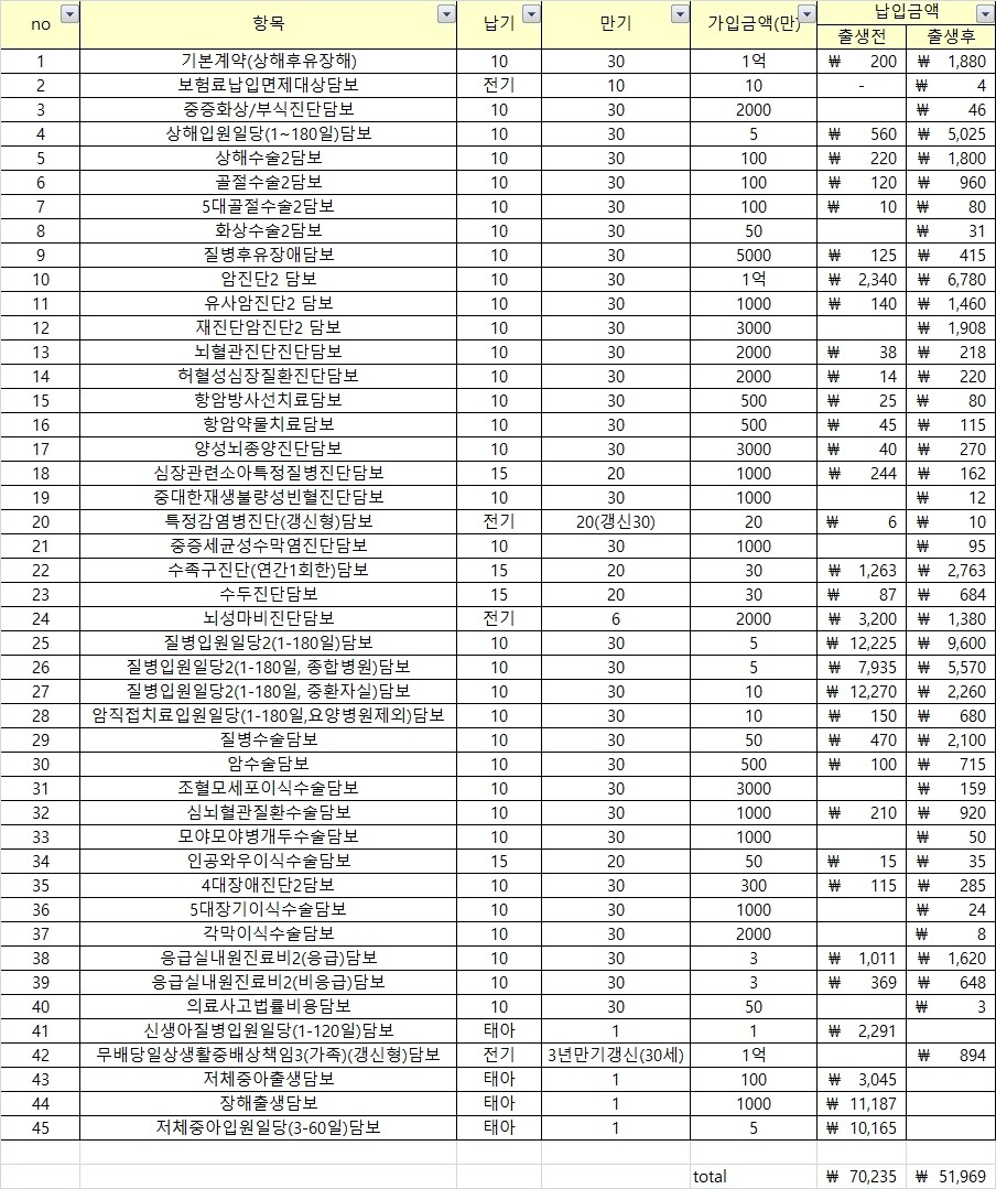 종합과 실손 모두 합쳐서 태아 때 기준으로 77,430원이 됩니다 20년은 총 54,520원으로 내용은 같습니다.
