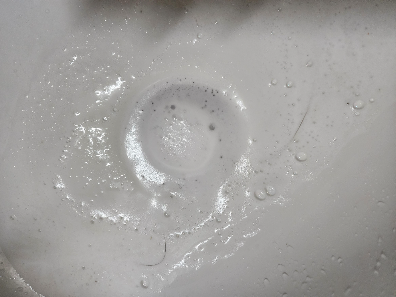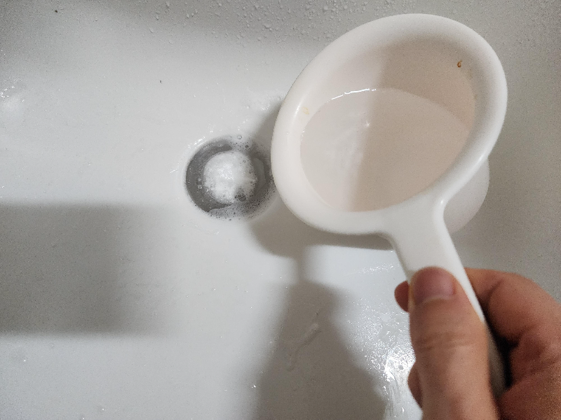 젓가락으로도 가루가 안들어가서 정수기에 85도 정도의 뜨거운 물을 부었습니다. 그러자 배수구에 들어가지 못한 가루가 부글부글 끓었다.