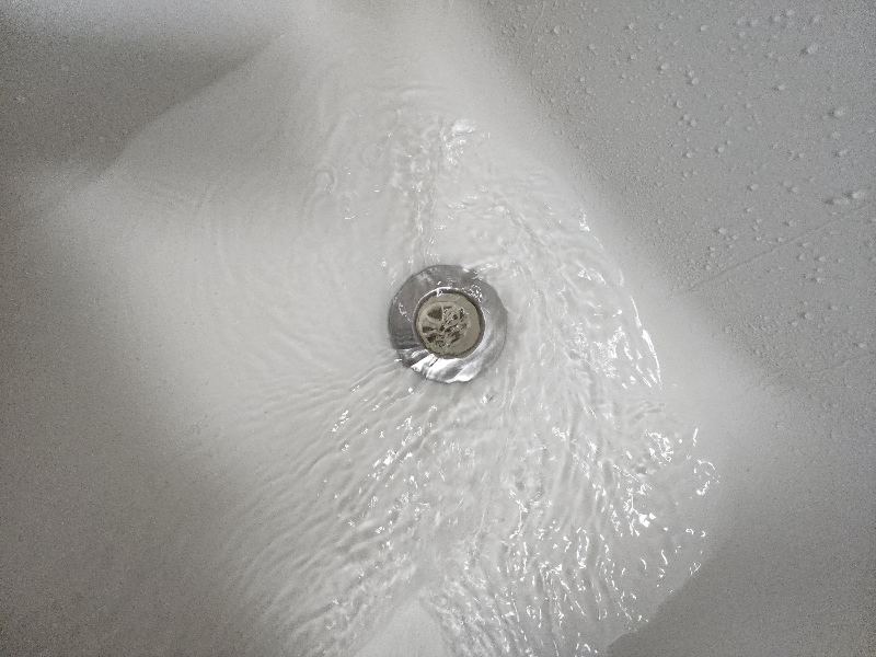 배수구 청소할 때 물은 한 번만 붓으라고 설명서에 나와 있어요. 그런데 물을 5번정도 부어서 욕조배수구 주변에 부글부글 올라온 거품을 배수구로 흘려보냈습니다. 설명서에 적힌 것보다 물을 조금 더 부었어요.
