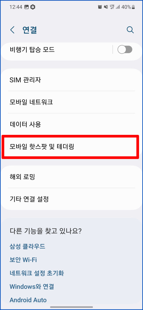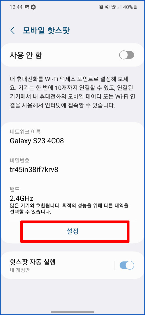 갤럭시 모바일 핫스팟 (설정) – (연결) – (모바일 핫스팟 및 테더링) – (모바일 핫스팟) 여기에서 오른쪽(비활성화) 버튼을 설정을 통해 활성화하여 Galaxy Hotspot에 연결할 수 있습니다.