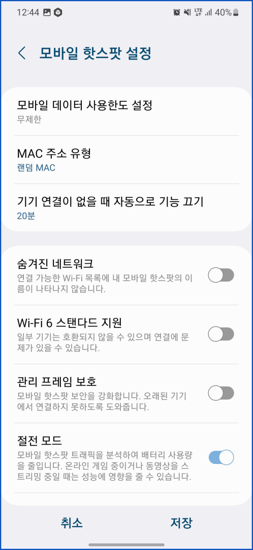 모바일 핫스팟 메뉴 아래 (고급의)누르면 모바일 데이터 사용량 제한 설정, 미연결 시 자동 해제 등 다양한 추가 설정이 가능하며, 절전 모드도 설정할 수 있다.