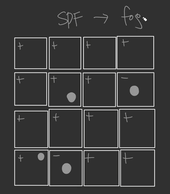 SDF 값에 -1을 곱하는 동안 내부 정보만 포그 정보로 변경되고 외부 부정 정보는 클램프로 삭제됩니다.