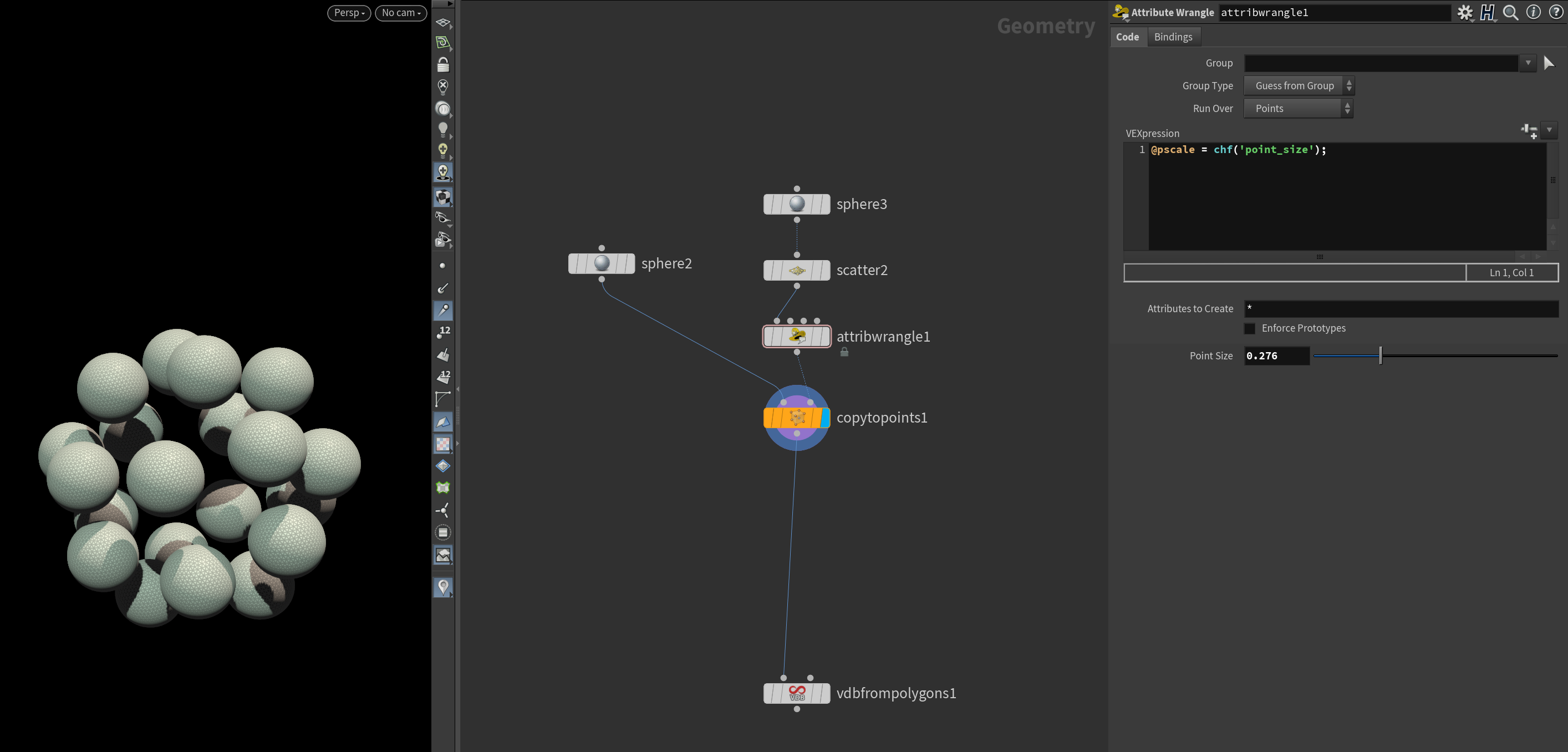 이제 값이 0.15가 되자마자 pscale이 vdbfrompolygons의 Voxel 크기에 비해 너무 작아지기 때문에 경계 상자가 작아지는 것을 볼 수 있습니다.