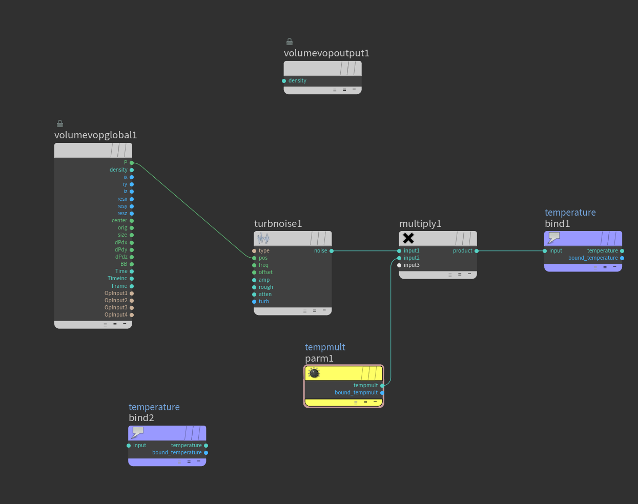 다음으로 볼륨 모양의 온도 값에 대한 볼륨 vop로 trubnoise를 사용합니다.