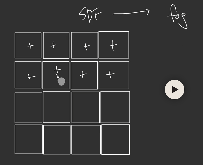 아래 그림의 박스를 복셀이라고 가정하고 그레이 포인트는 pscale이 작아질 때이며, 복셀 중간에 sdf 정보가 없기 때문에 sdf 외부에 양의 값이 있을 것으로 판단됩니다.