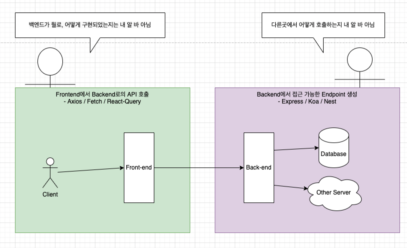 디바이스 성능의 향상과 웹사이트의 복잡화로 인해 사용자에게 보여지는 페이지, 즉 프런트엔드에서 요구하는 사양이 점점 더 복잡해지고 있어 빠른 개발이 요구되고 있습니다. 그래서 FE 개발자들은 정말로 FE에 집중할 수 있기를 원하고 다양한 교육 기관에서 그것을 가르친다는 것을 알고 있습니다. 이러한 이상적인 환경은 아래 그림과 같습니다.